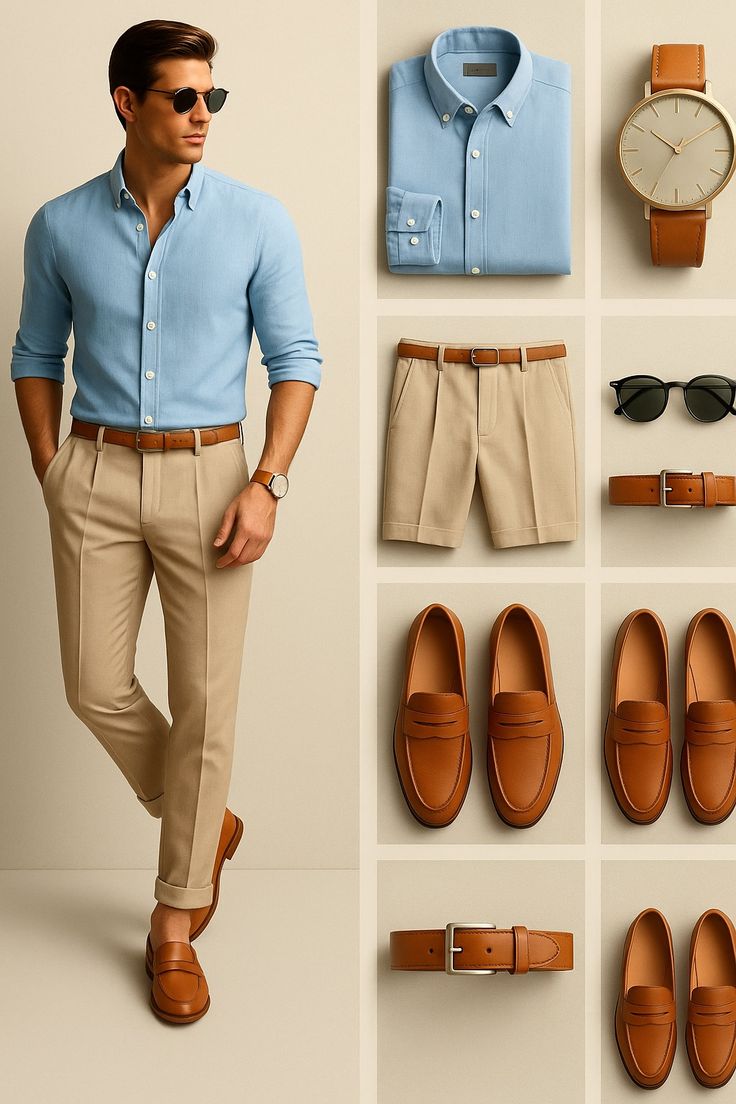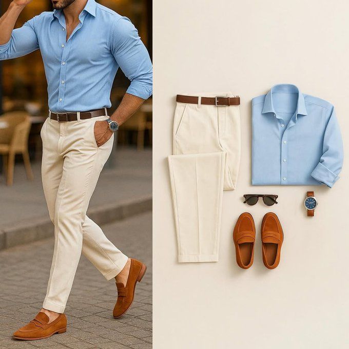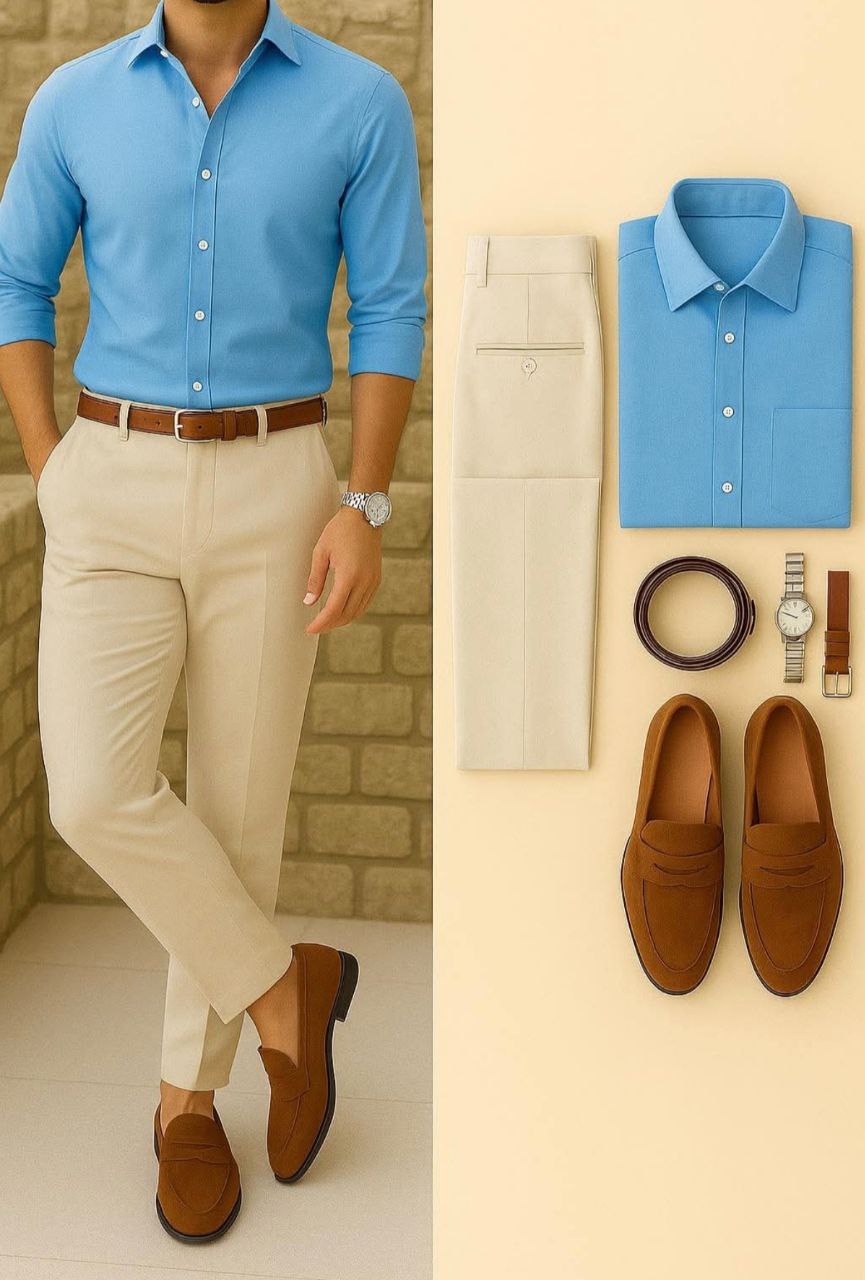 Men’s elegant and modern outfit featuring a light blue long-sleeve shirt, tailored beige trousers, and brown loafers. A refined, versatile look ideal for office wear, formal occasions, or smart casual style.